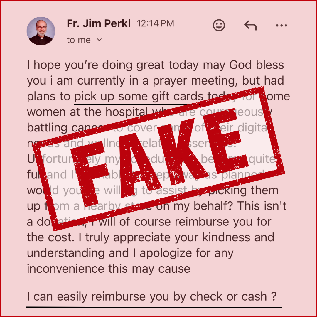 Some Mary Mother parishioners have received emails that appear to come from Fr. Jim and ask the recipient to purchase gift cards to help someone in need. This is a scam.
